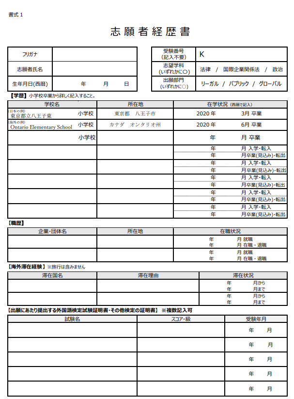 中央大学・チャレンジ入学試験の出願時には志願経歴書を作成します。志願経歴書は中央大学が所定のフォーマットを用意していますので、ダウンロードして使用してください。
