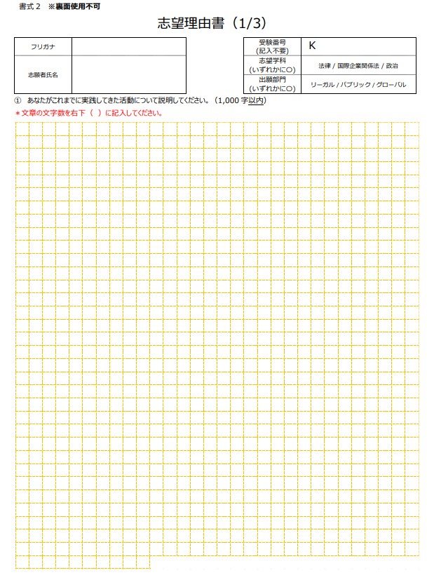 中央大学・チャレンジ入学試験では出願時に志望理由書の提出も必要です。志望理由書は所定のフォーマットを使用して作成してください。