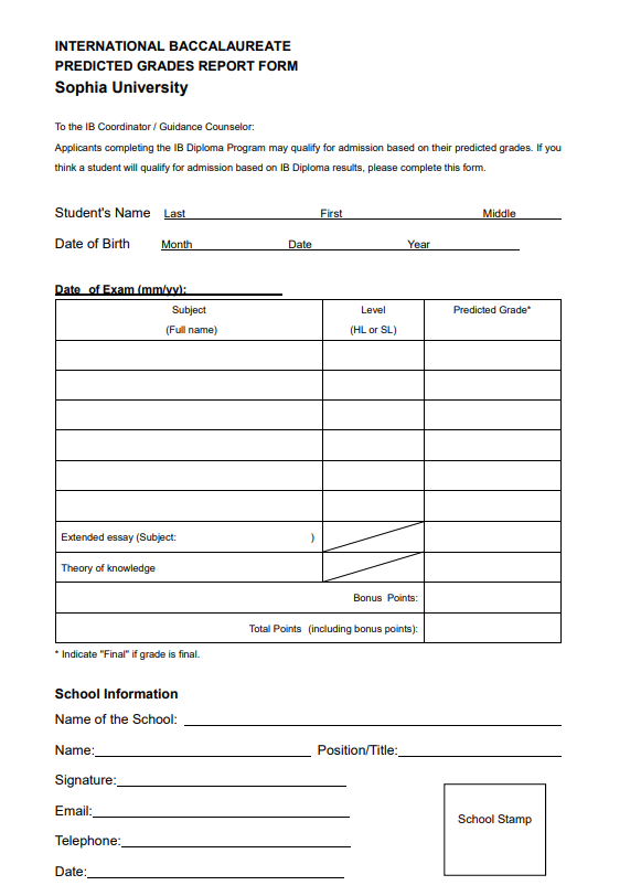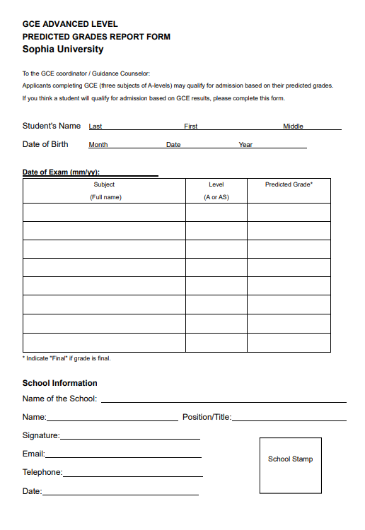 ただし、IB 予想成績レポートまたはGCE Aレベル 予想成績レポートを使用する場合には学校から書類のアップロード・郵送・メールでの提出が必要です。