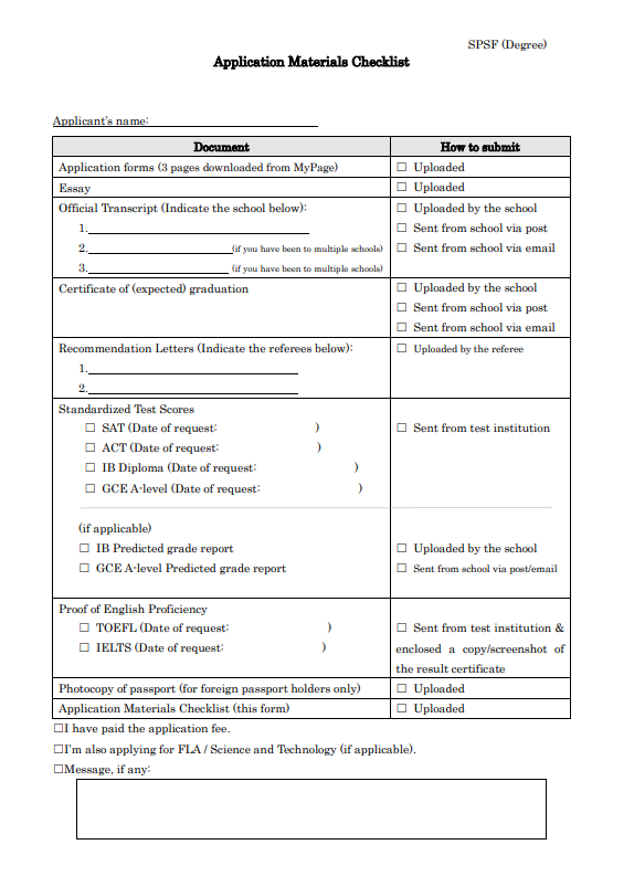 SPSF入学試験の出願時には、出願書類に抜け漏れがないことを確認するための出願書類チェックリスト提出を提出します。