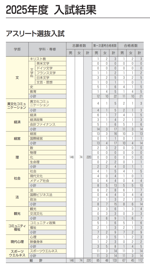 下表は、2025年度アスリート選抜入試の学部・学科別データです。