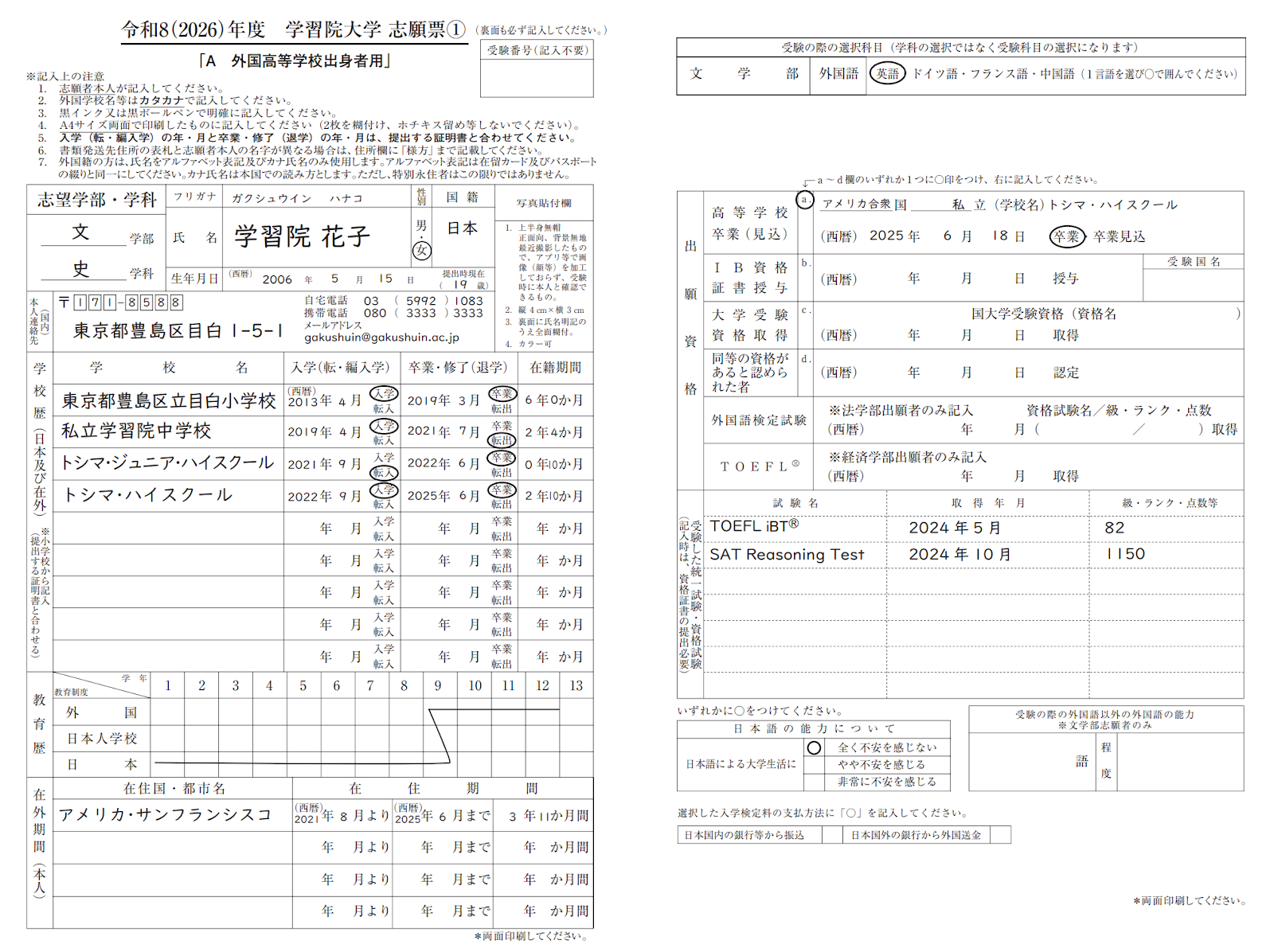 参考:令和8(2026)年度学習院大学総合型選抜(外国高等学校出身者及び帰国生徒)募集要項