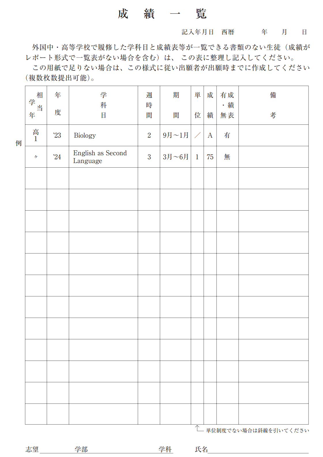 外国の高等学校における成績を証明する、成績証明書も提出します。学校長の署名・押印が必要です。英文もしくは日本語翻訳版を提出します。最終学年を含む2学年以上の成績が記載されていることが条件です。