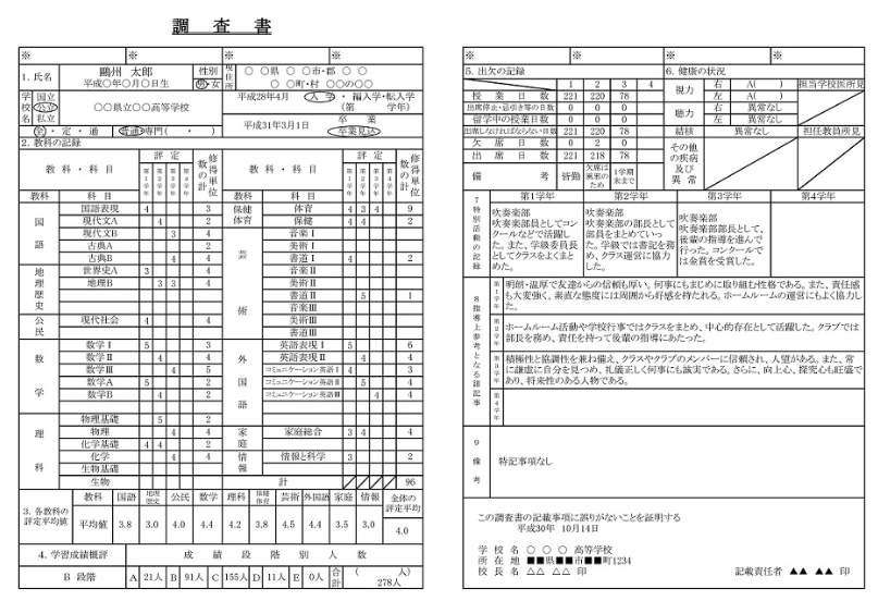 出願時には所属する高校の学校長が作成した「調査書」の提出が必要となります。調査書に必要な記載事項は以下の3つです。