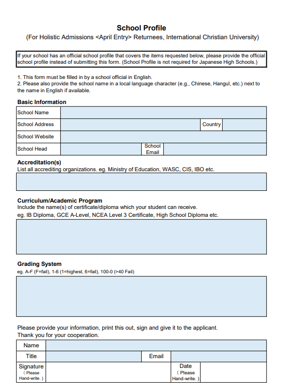 ICU(国際基督教大学)・帰国生入試の出願には「School Profile」と呼ばれる高等学校の概要を記載した書類が求められます。