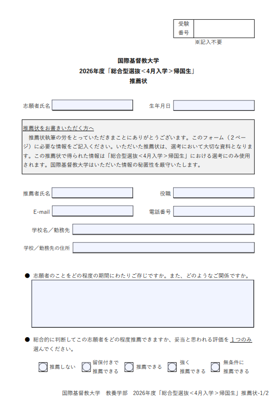 推薦状は日本語と英語どちらにも対応できるよう用意されています。推薦者の言語に合わせてICUのWebサイトより所定フォーマットをダウンロードして使用してください。